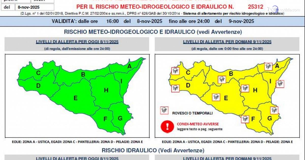 La Sicilia si prepara ad affrontare condizioni meteorologiche avverse. La Protezione civile regionale ha emesso un avviso di allerta gialla per rischio meteo-idrogeologico e idraulico, valido fino alla mezzanotte di domenica 9 novembre.