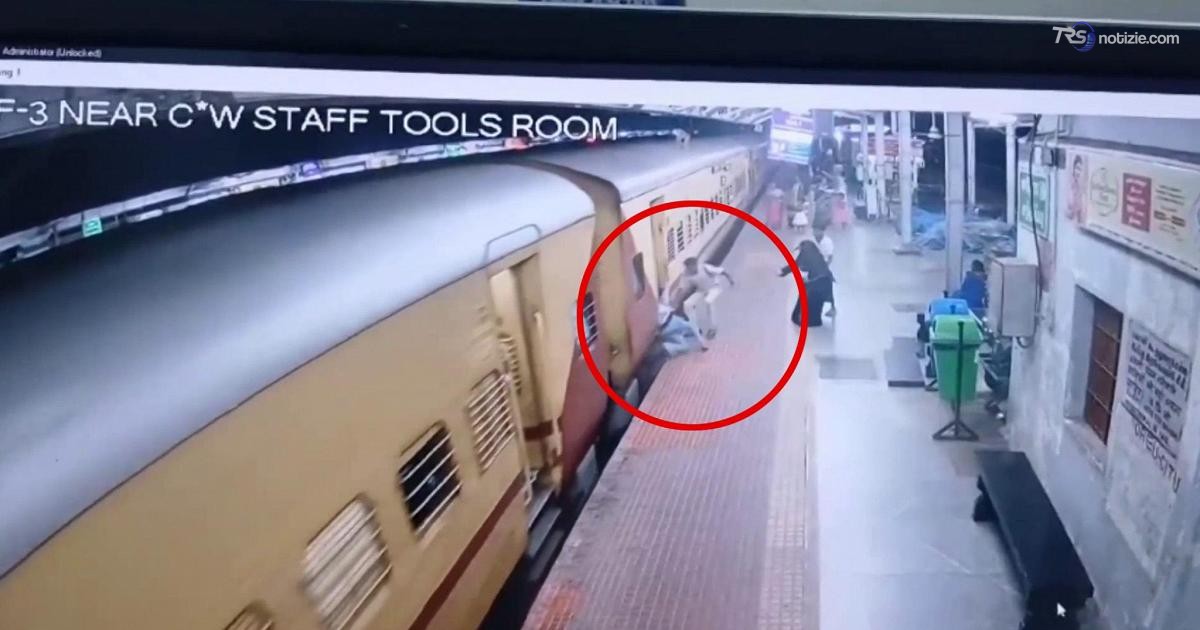 Un video di sorveglianza registrato alla stazione di Erode Junction, nel Tamil Nadu, mostra una donna che tenta di salire su un treno in movimento e scivola nello spazio tra la banchina e le carrozze. Un agente della polizia ferroviaria, accortosi del pericolo, interviene prontamente e riesce a trascinarla via prima che venga travolta. Entrambi cadono a terra, ma fortunatamente rimangono illesi.